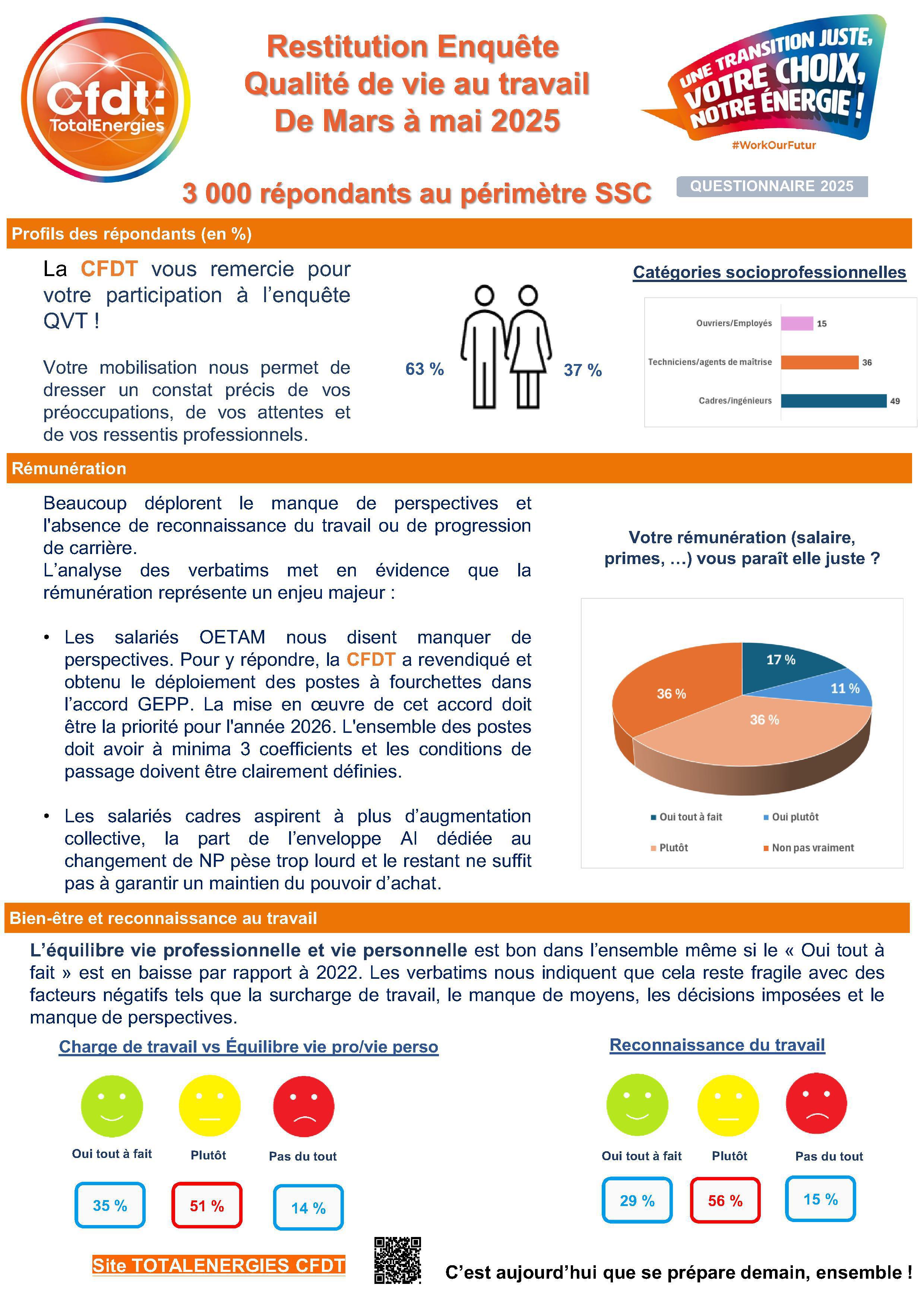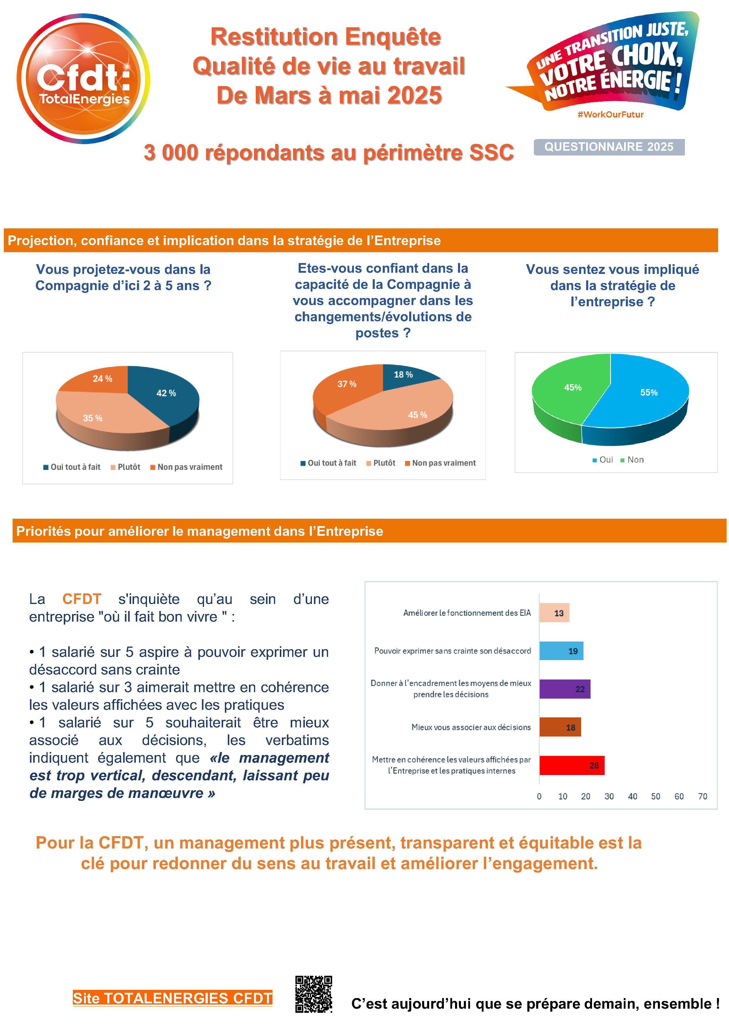 Au printemps 2025, la CFDT TotalEnergies a conduit une vaste enquête sur la qualité de vie au travail (QVT) au périmètre du SSC, près de 3 000 salariés ont répondu.